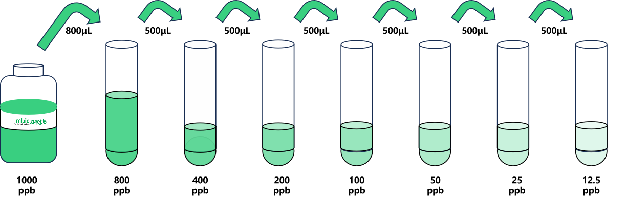試劑盒中取出標(biāo)準(zhǔn)品,準(zhǔn)備7個試管,先將1000ppb標(biāo)準(zhǔn)品(1mL)按需吸取一定量用1×稀釋液稀釋至800ppb(例:800µL的標(biāo)準(zhǔn)品母液+200µL的1×稀釋液,制備得到1000μL的800ppb濃度標(biāo)準(zhǔn)品),隨后在6個試管中分別加入500μL的1×稀釋液,在這6個單獨的試管中將800ppb標(biāo)準(zhǔn)品依次2倍倍比稀釋至7個梯度,共配制7個濃度的標(biāo)準(zhǔn)品,依次為:800ppb、400ppb、200ppb、100ppb、50ppb、25ppb、12.5ppb,從最高濃度標(biāo)準(zhǔn)品溶液中吸取500μL標(biāo)準(zhǔn)品到下一個試管中,輕輕吹打混勻,以此類推進(jìn)行標(biāo)準(zhǔn)品的倍比稀釋(如圖所示),1×稀釋液用作零濃度標(biāo)準(zhǔn)品(0ppb)。